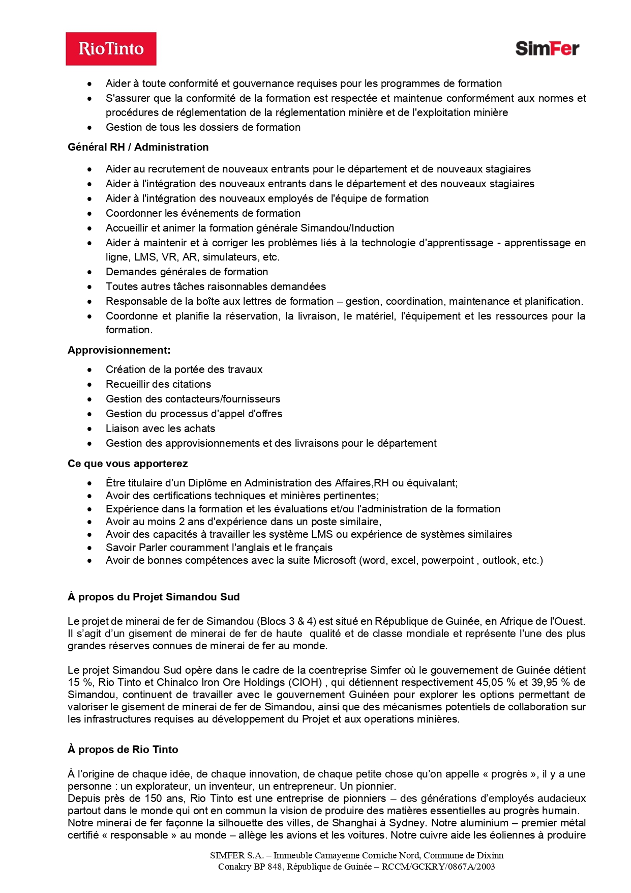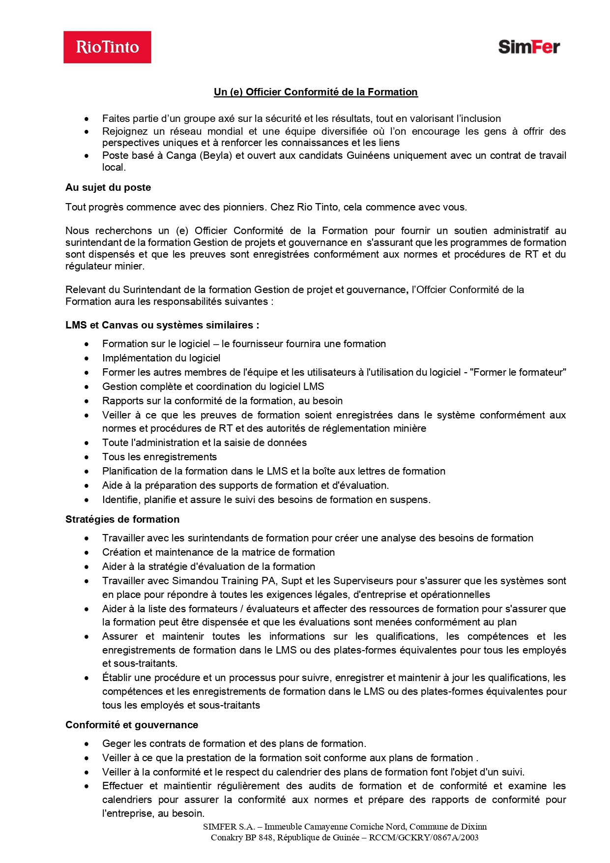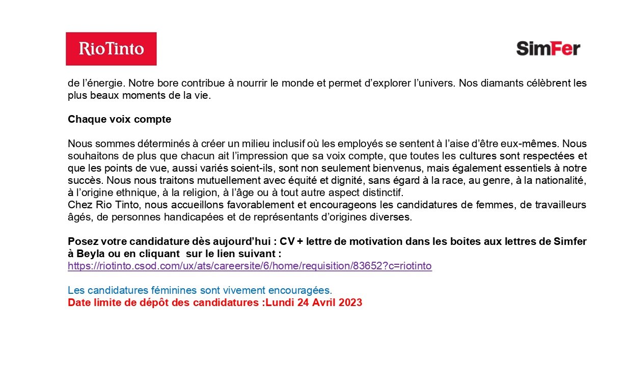Posez votre candidature dès aujourdâhui : CV + lettre de motivation dans les boites aux lettres de Simfer à Beyla ou en cliquant sur le lien suivant : https://riotinto.csod.com/ux/ats/careersite/6/home/requisition/83652?c=riotinto