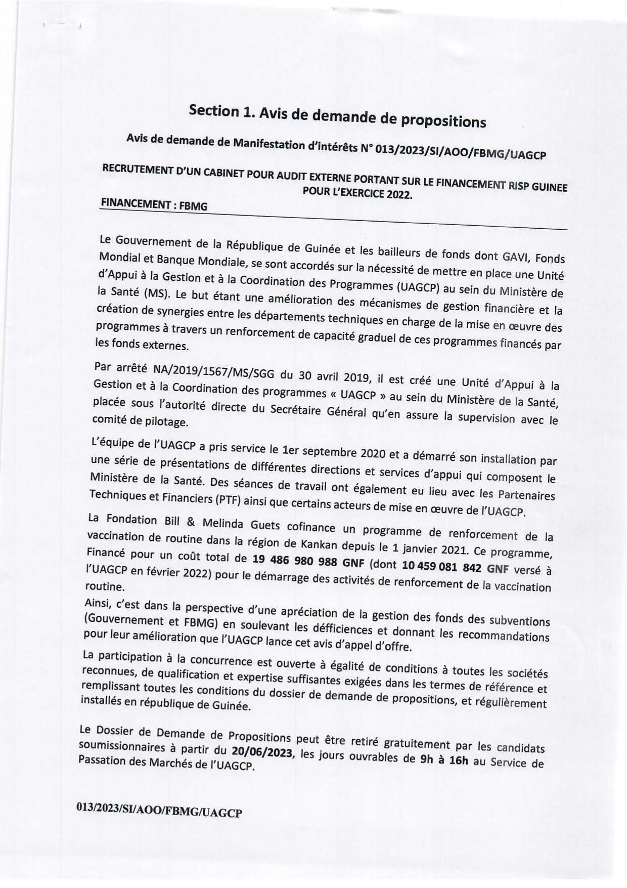 Appels d'offres AVIS DE RECRUTEMENT D’UN CABINET POUR AUDIT EXTERNE PORTANT SUR LE FINANCEMENT RISP GUINEE POUR L’EXERCICE 2022. Par Sékou Mohamed SAVANE - 19 juin 2023 0 89 FacebookTwitterPinterestWhatsApp