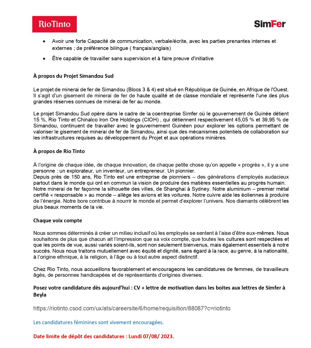 Posez votre candidature dès aujourd’hui : CV + lettre de motivation dans les boites aux lettres de Simfer àBeyla