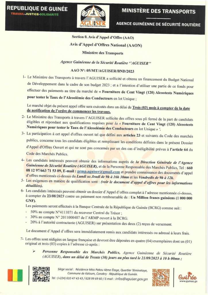 Appels d'offres AVIS D’APPEL D’OFFRES N 05/MT/AGUISER/BND/2023 Par Sékou Mohamed SAVANE - 4 septembre 2023 0 171 FacebookTwitterPinterestWhatsApp