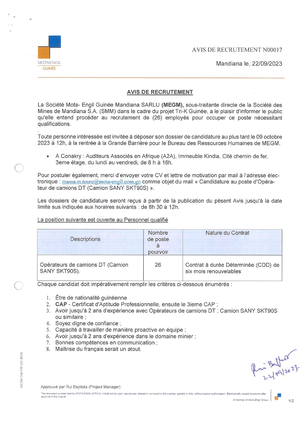 Opportunités d'emplois Avis de recrutement d’Opérateurs Camions DT (Camion SANY SKT90S) Par Sékou Mohamed SAVANE - 3 octobre 2023 0 141 FacebookTwitterPinterestWhatsApp
