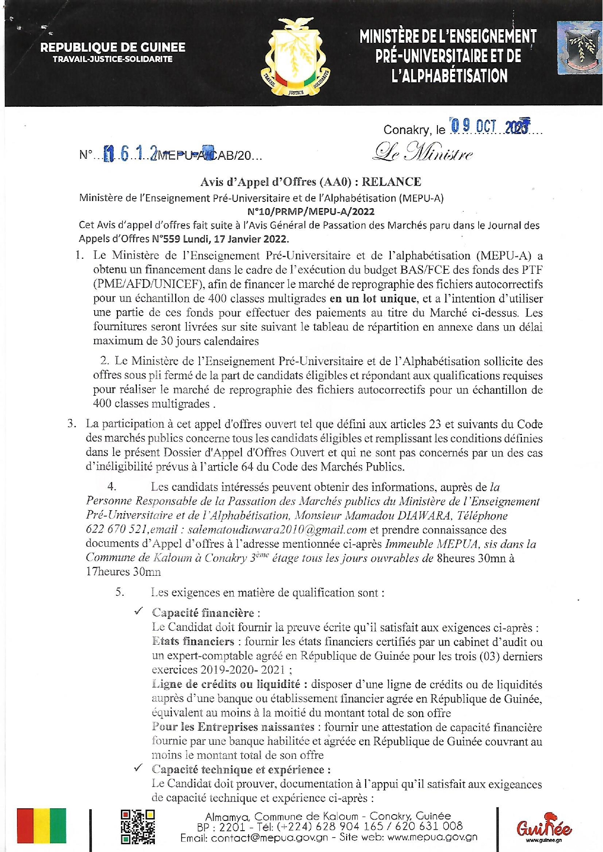Appels d'offres Avis d’appel d’offres pour le marché de reprographie des fichiers autocorrectifs pour un échantillon de 400 classes multigrades en un lot unique Par Sékou Mohamed SAVANE - 17 octobre 2023 0 142 FacebookTwitterPinterestWhatsApp
