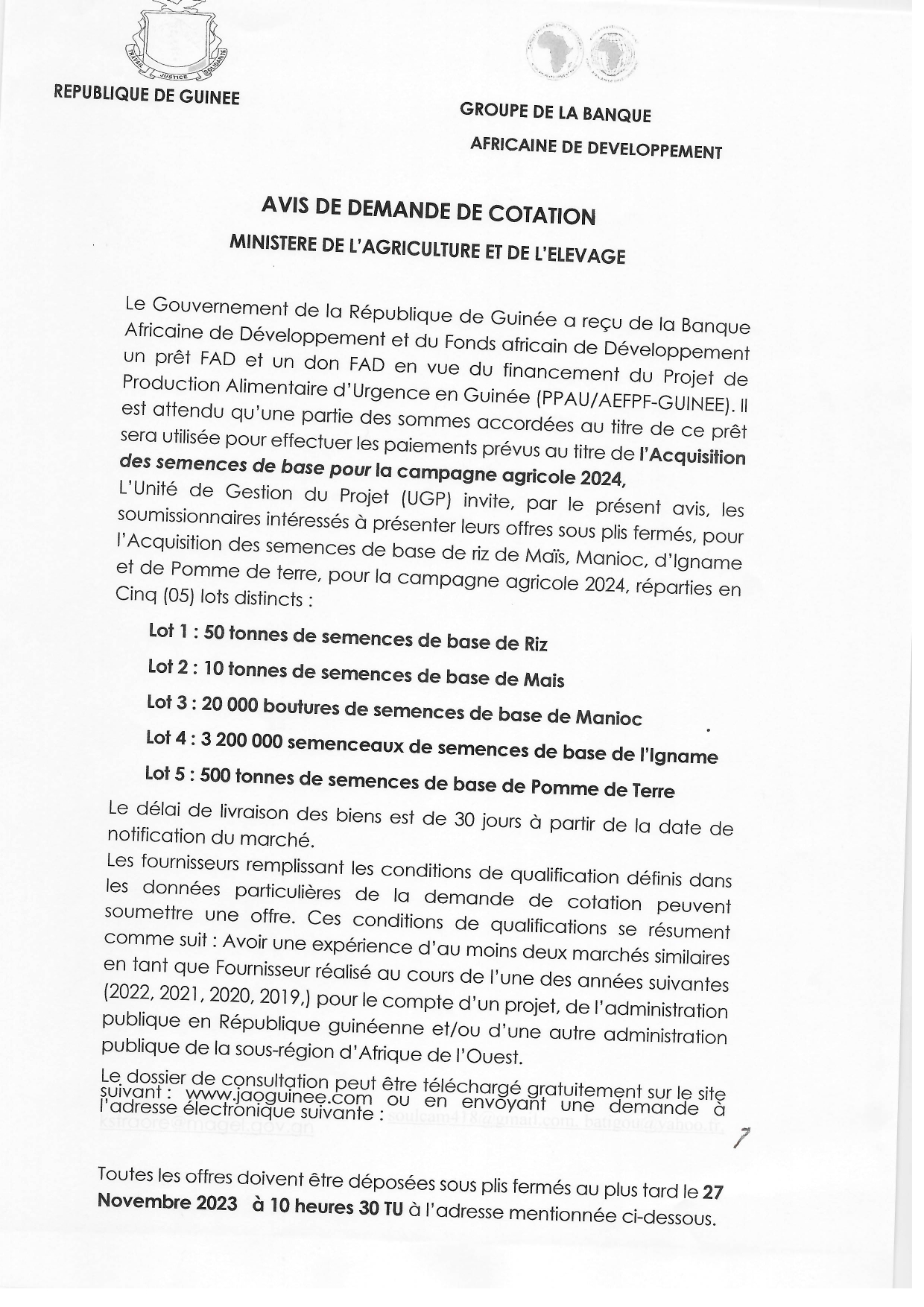 Appels d'offres Avis d’appel d’offres pour lâAcquisition des semences de base pour la campagne agricole 2024 Par Sékou Mohamed SAVANE - 14 novembre 2023 0 166 FacebookTwitterPinterestWhatsApp Télécharger le DAO complet en PDF