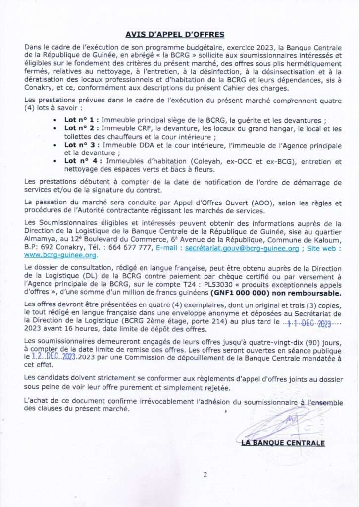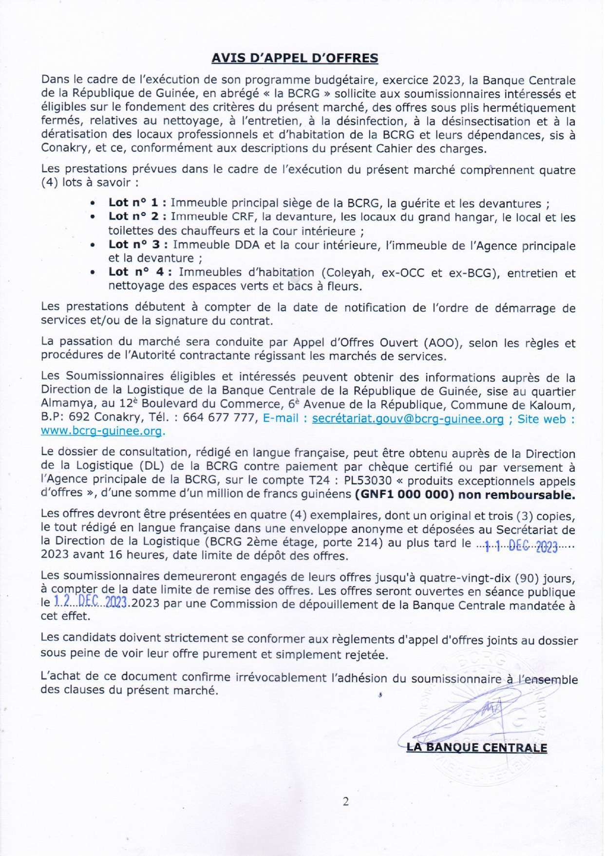 Appels d'offres Avis d’appel d’offres pour les marchés relatives au nettoyage, à l’entretien, à la désinfection, à la désinsectisation et à la dératisation des locaux professionnels et d’habitation de la BCRG et leurs dépendances, sis à Conakry Par Sékou Mohamed SAVANE - 27 novembre 2023 0 250 FacebookTwitterPinterestWhatsApp