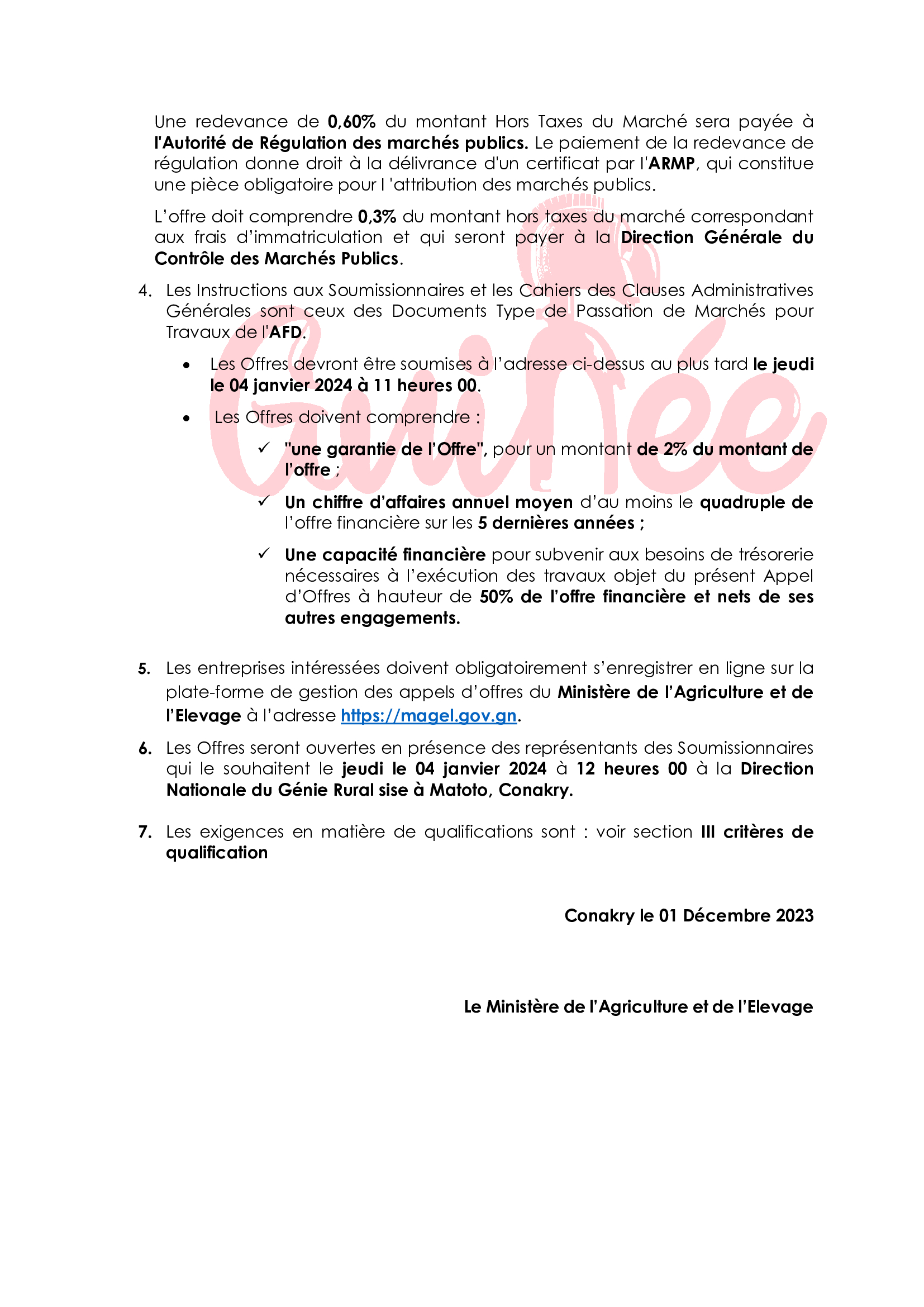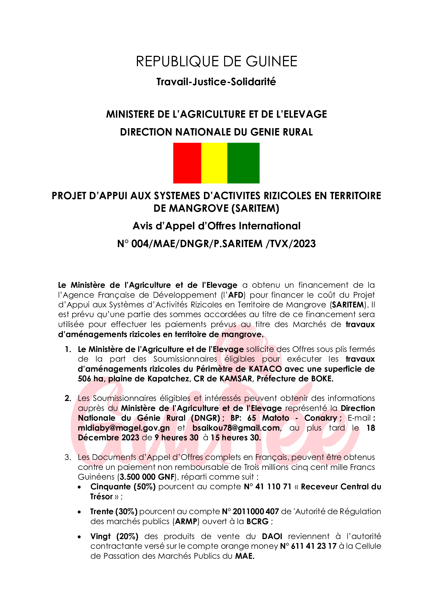 Appels d'offres SARITEM: Avis dâAppel dâOffres International pour des travaux dâaménagements rizicoles du Périmètre de KATACO avec une superficie de 506 ha, plaine de Kapatchez, CR de KAMSAR, Préfecture de BOKE Par Sékou Mohamed SAVANE - 4 décembre 2023 0 164 FacebookTwitterPinterestWhatsApp