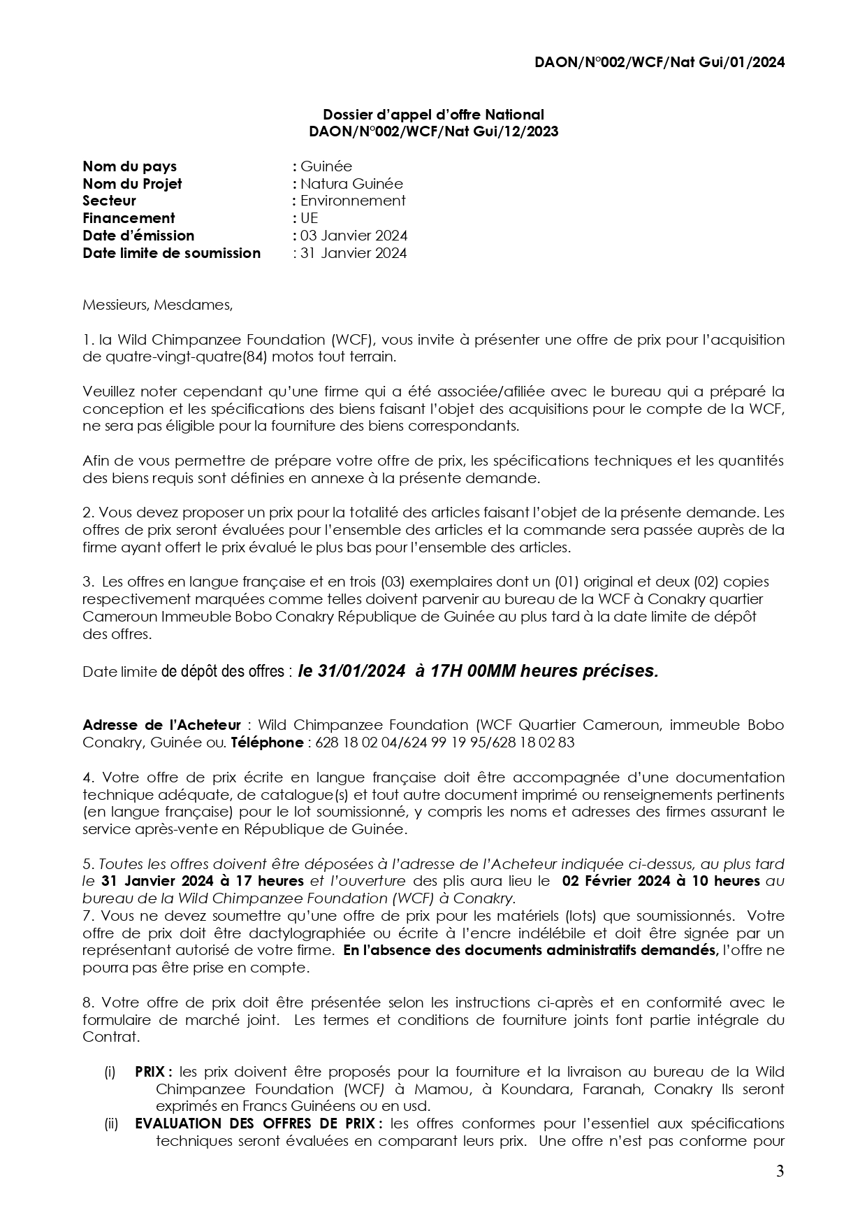 Appels d'offres DOSSIER DâAPPEL DâOFFRE RELATIF A LâACQUISITION DE QUATREVINGT-QUATRE (84) MOTOS TOUT TERRAIN EN FAVEUR DU PROJET NATURAGUINEE/Wild Chimpanzee Foundation (Lot unique) Par Sékou Mohamed SAVANE - 2 janvier 2024 0 156 FacebookTwitterPinterestWhatsApp Télécharger l’avis complet en PDF