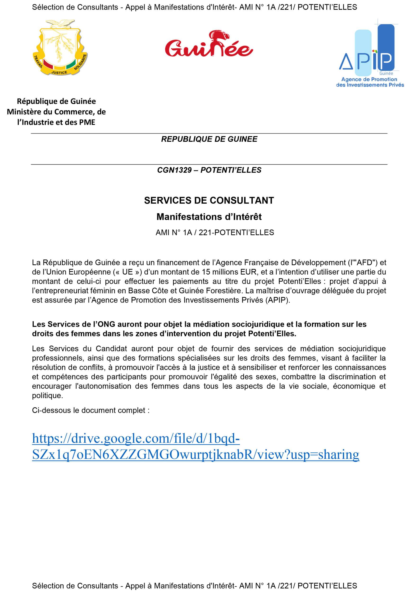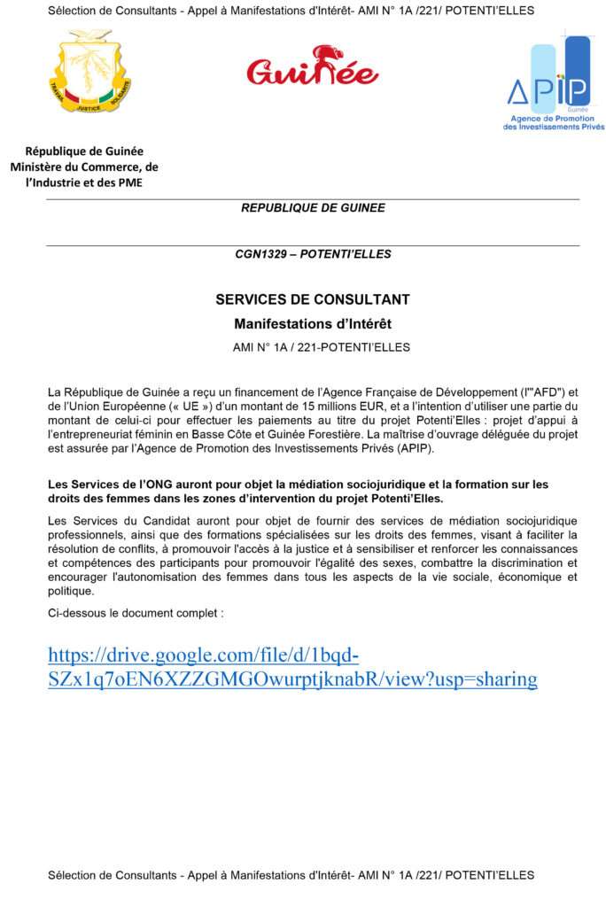 Appels d'offres Recrutement d’ONG pour la médiation sociojuridique et la formation sur les droits des femmes dans les zones d’interventions du projet Potenti’ELLES Par Sékou Mohamed SAVANE - 10 janvier 2024 0 297 FacebookTwitterPinterestWhatsApp