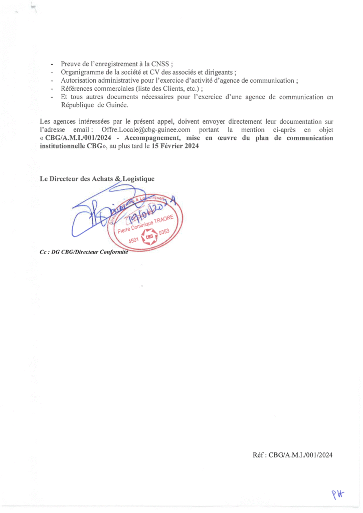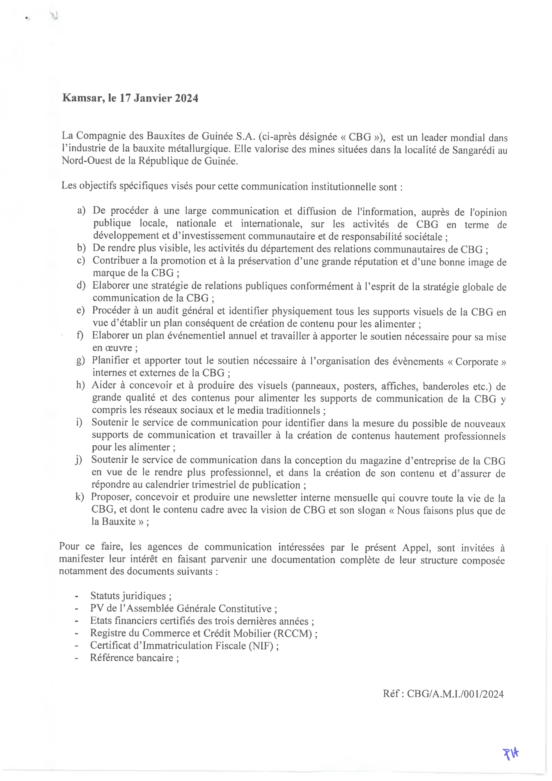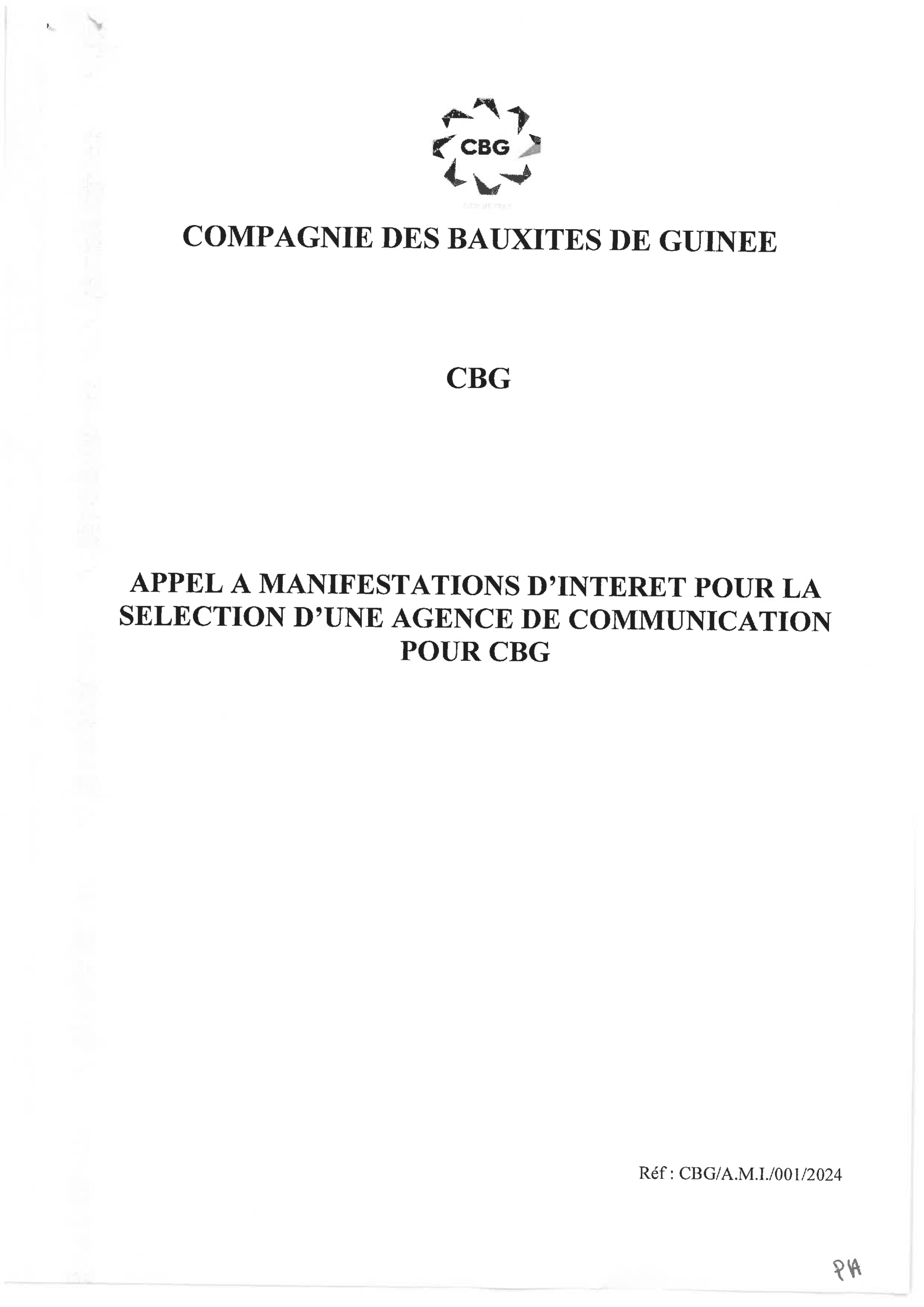 Appels d'offres Appel à manifestations dâintérêt pour la sélection dâune agence de communication pour la CBG Par Sékou Mohamed SAVANE - 22 janvier 2024 0 205 FacebookTwitterPinterestWhatsApp