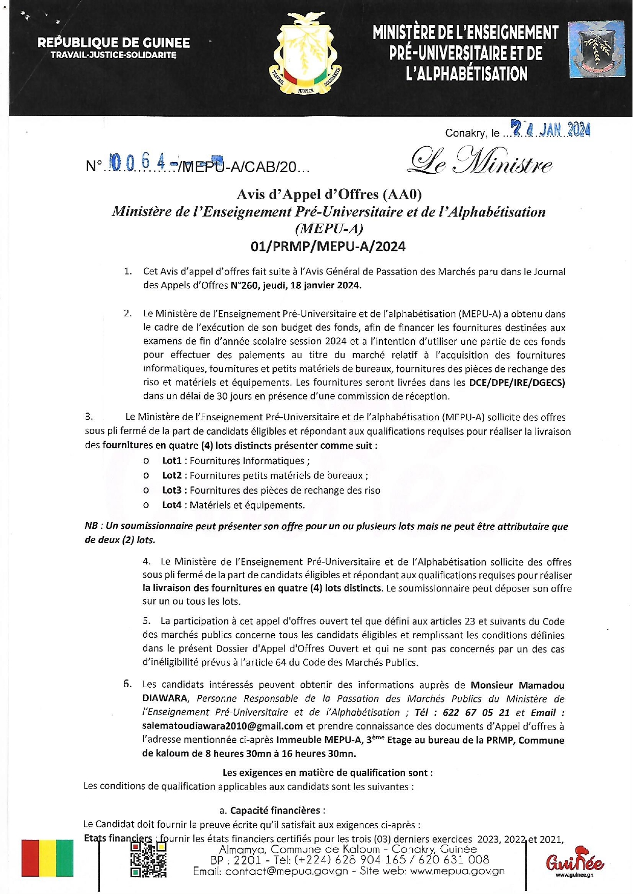 Appels d'offres Avis d’appel d’offres pour le marché relatif à l’acquisition des fournitures informatiques, fournitures et petits matériels de bureaux, fournitures des pièces de rechange des riso et matériels et équipements Par Sékou Mohamed SAVANE - 29 janvier 2024 0 221 FacebookTwitterPinterestWhatsApp