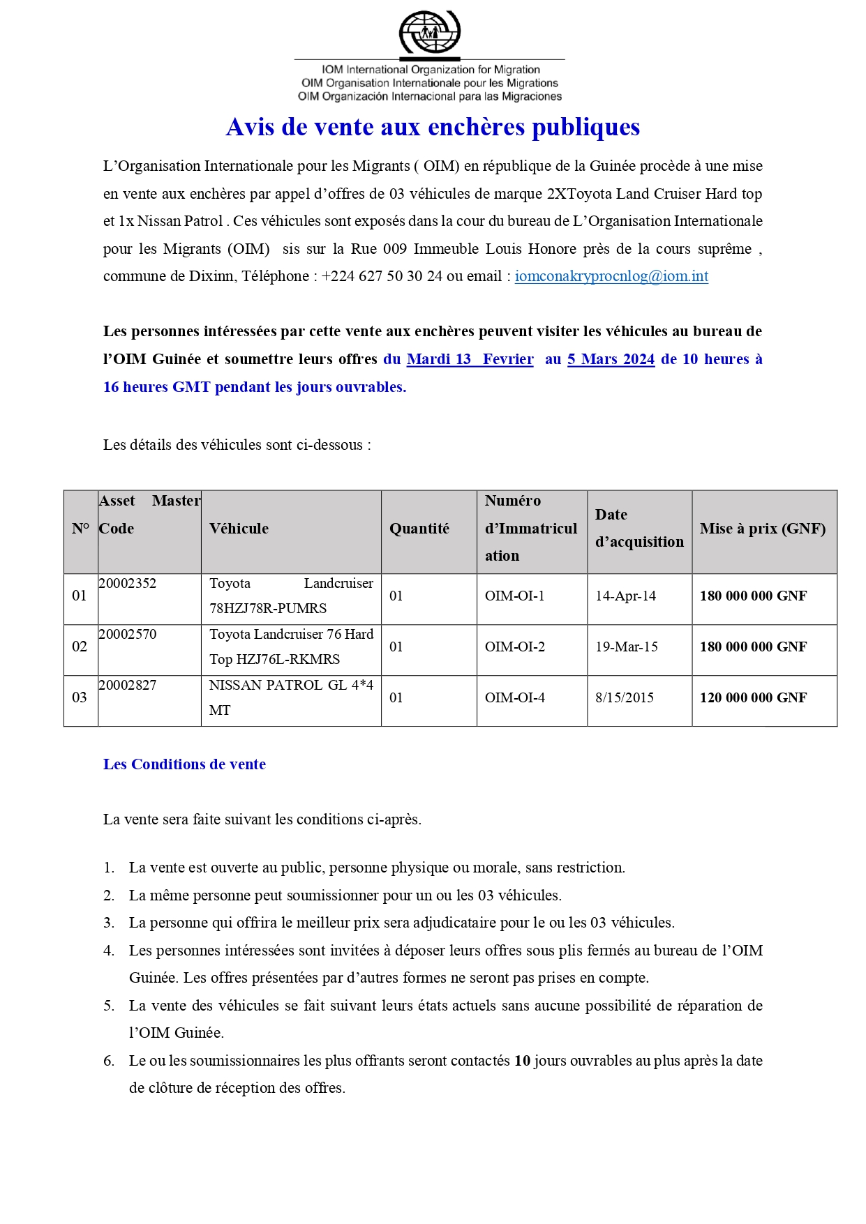 Appels d'offres Avis de vente aux enchères publiques : e 03 véhicules de marque 2XToyota Land Cruiser Hard top et 1x Nissan Patrol Par Sékou Mohamed SAVANE - 15 février 2024 0 122 FacebookTwitterPinterestWhatsApp