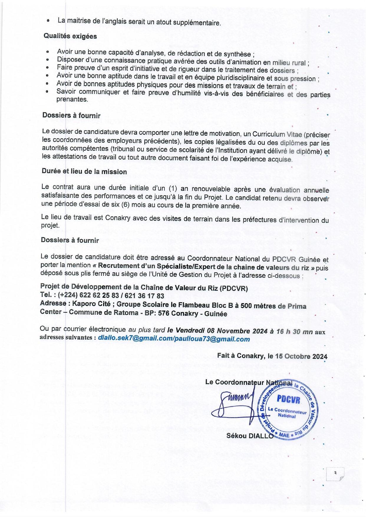 Appels d'offres APPEL A CANDIDATURE POUR LE RECRUTEMENT DâUN SPECIALISTE/EXPERT DE LA CHAINE DE VALEURS DU RIZ Par Sékou Mohamed SAVANE - 21 octobre 2024 0 114 FacebookTwitterPinterestWhatsApp