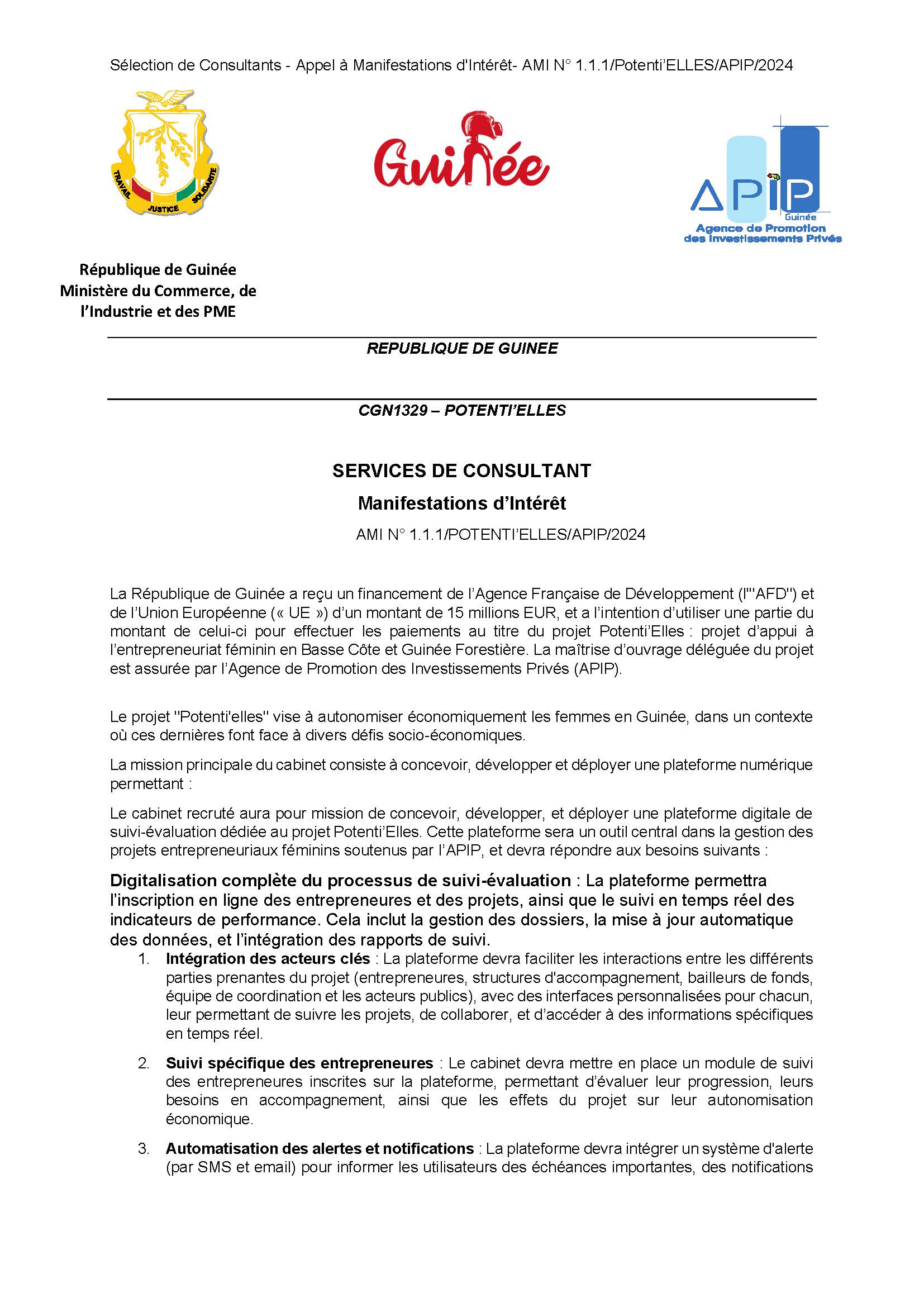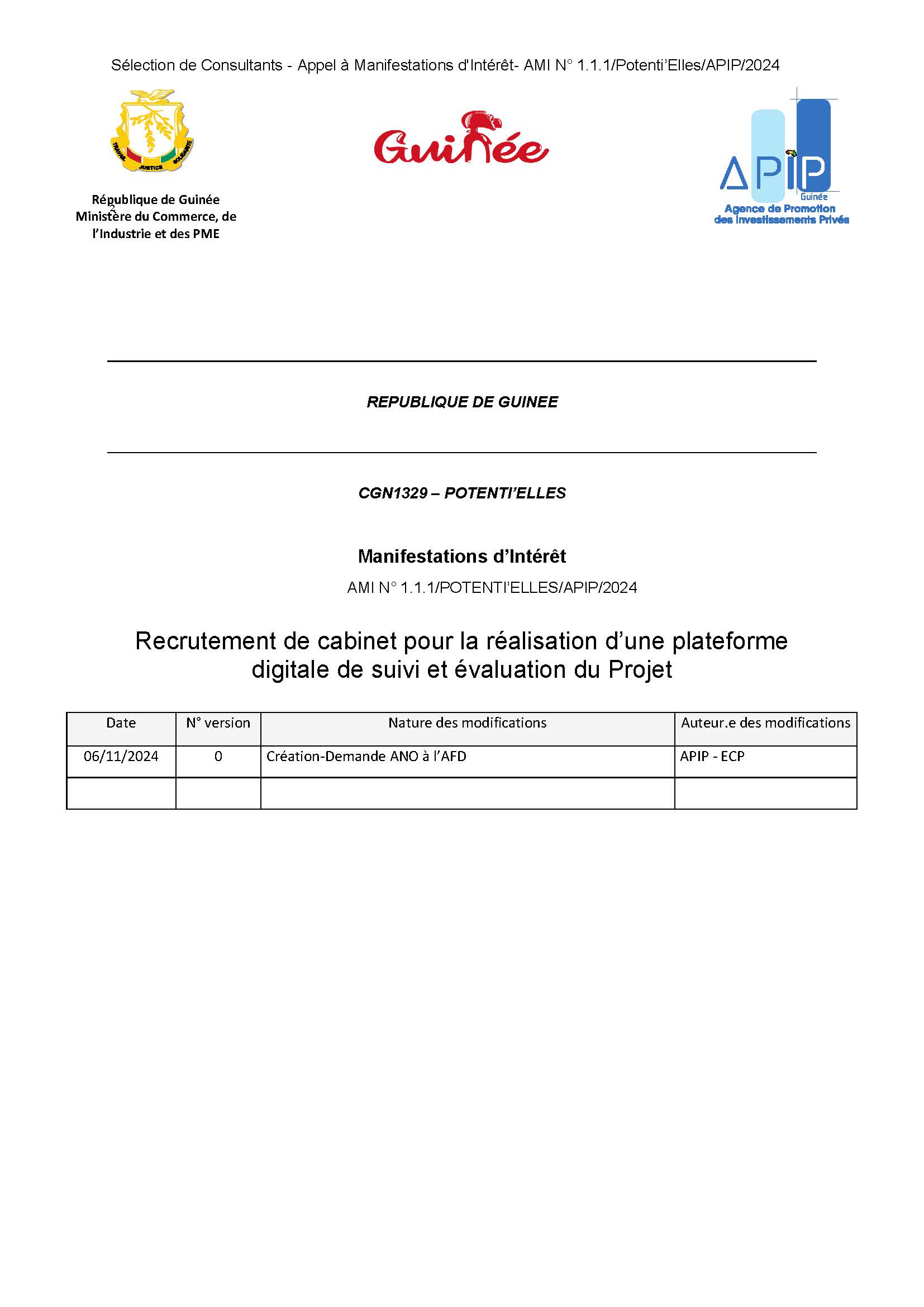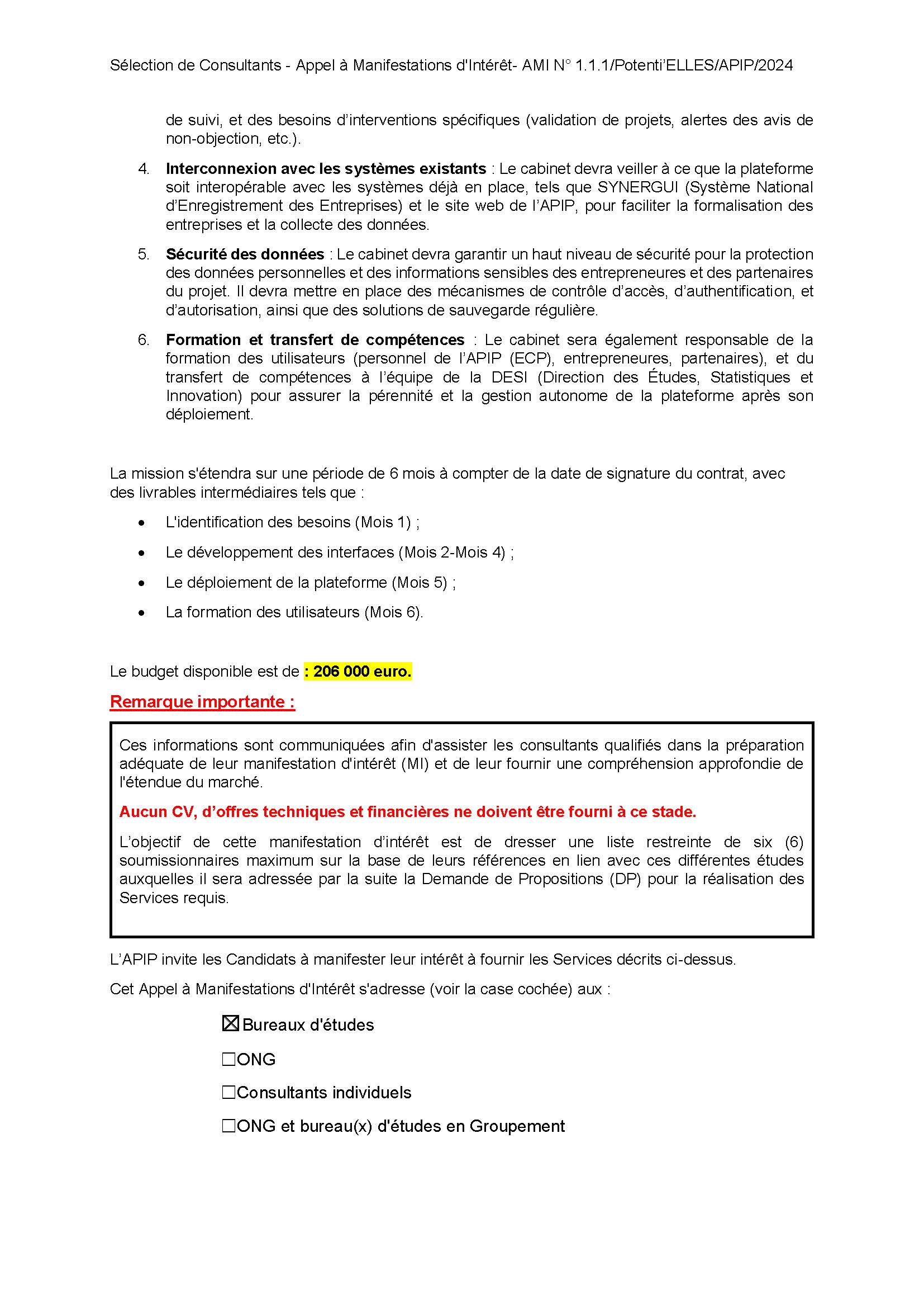 Appels d'offres Recrutement de cabinet pour la réalisation dâune plateforme digitale de suivi et évaluation du Projet Par lesannonces1compte - 23 décembre 2024 0 216 FacebookTwitterPinterestWhatsApp Télécharger l’avis en pdf