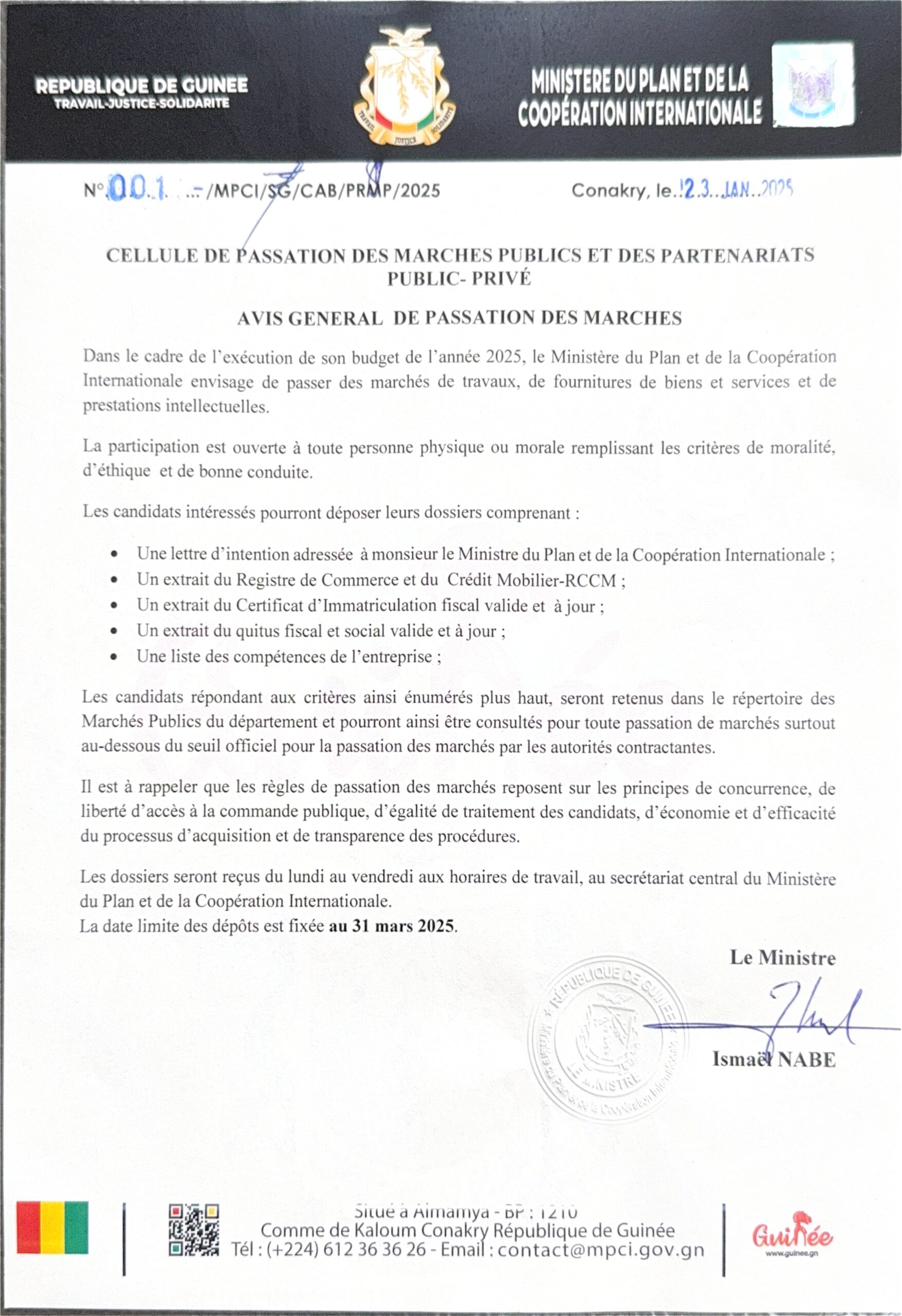 Appels d'offres AVIS GENERAL DE PASSATION DES MARCHES: Ministère du Plan et de la Coopération Internationale Par Sékou Mohamed SAVANE - 27 janvier 2025 0 45 FacebookTwitterPinterestWhatsApp Télécharger le PPM