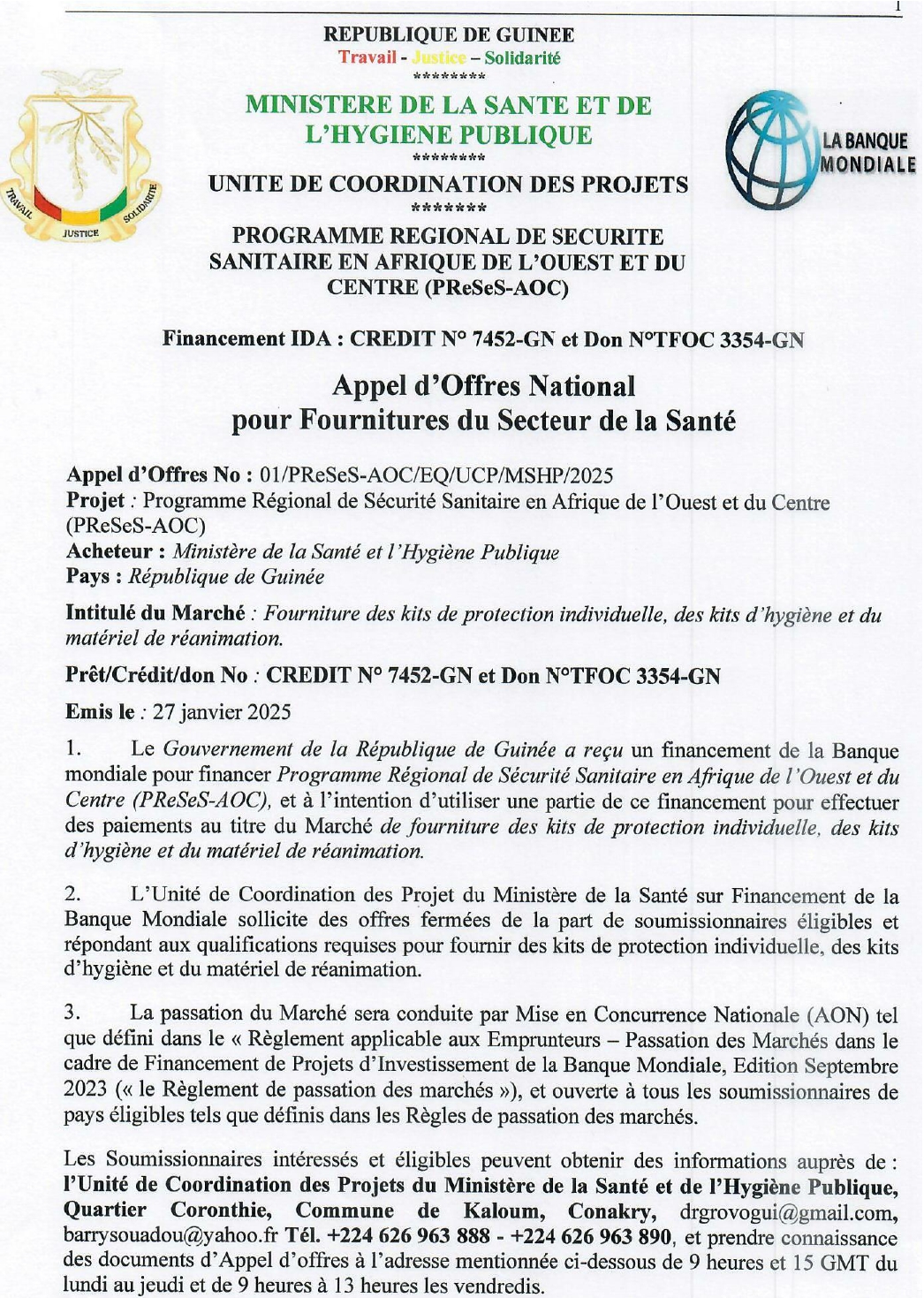 Appels d'offres Appel dâOffres National pour la Fourniture des kits de protection individuelle, des kits dâhygiène et du matériel de réanimation Par Sékou Mohamed SAVANE - 27 janvier 2025 0 61 FacebookTwitterPinterestWhatsApp