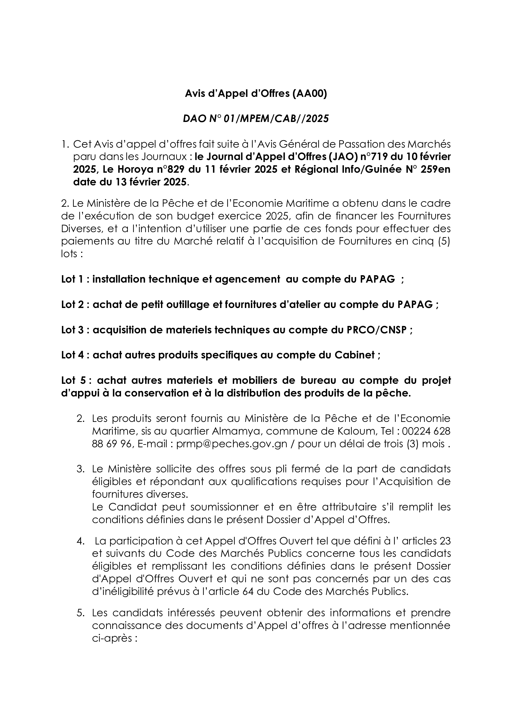Appels d'offres Avis d’appel d’offres pour le Marché relatif à lâacquisition de Fournitures en cinq (5) lots Par Sékou Mohamed SAVANE - 10 mars 2025 0 75 FacebookTwitterPinterestWhatsApp