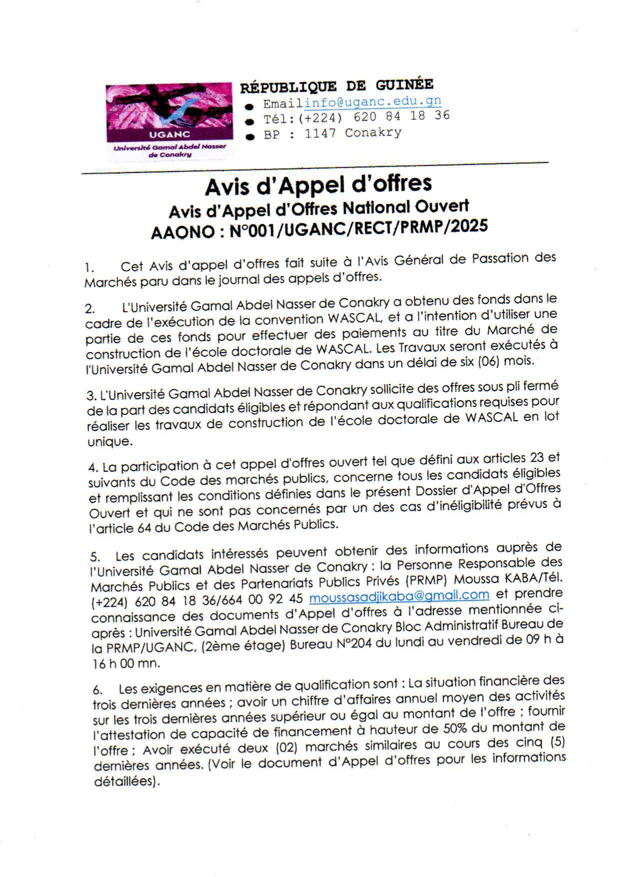 Appels d'offres Avis d’Appel d’Offres National Ouvert Pour le Marché de construction de l’école doctorale de WASCAL Appel d’Offres Par Sékou Mohamed SAVANE - 17 mars 2025 0 81 FacebookTwitterPinterestWhatsApp