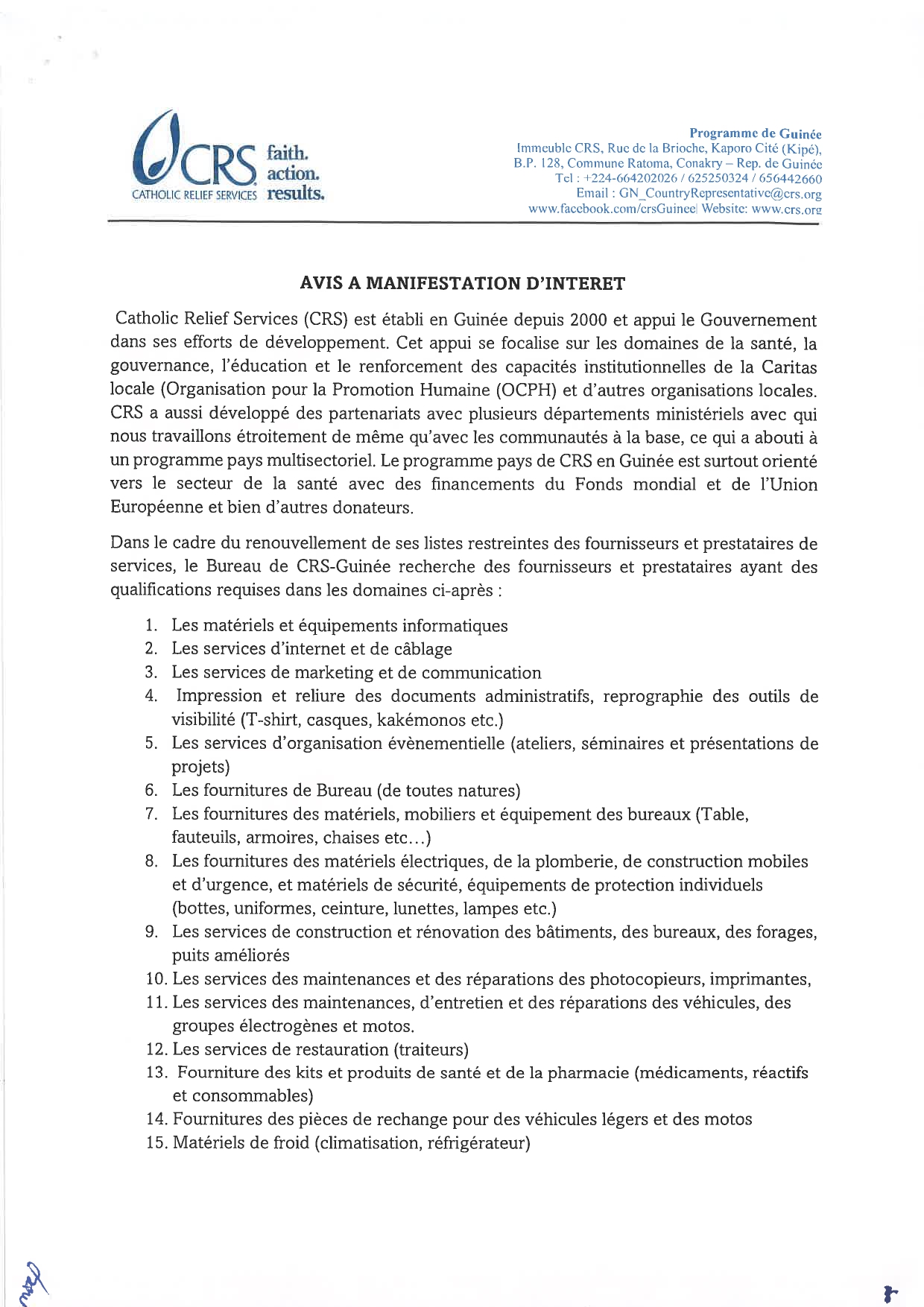 Appels d'offres Avis à manifestation d’interêt pour le renouvellement de la base de données des fournisseurs de CRS Par Sékou Mohamed SAVANE - 3 avril 2025 0 61 FacebookTwitterPinterestWhatsApp