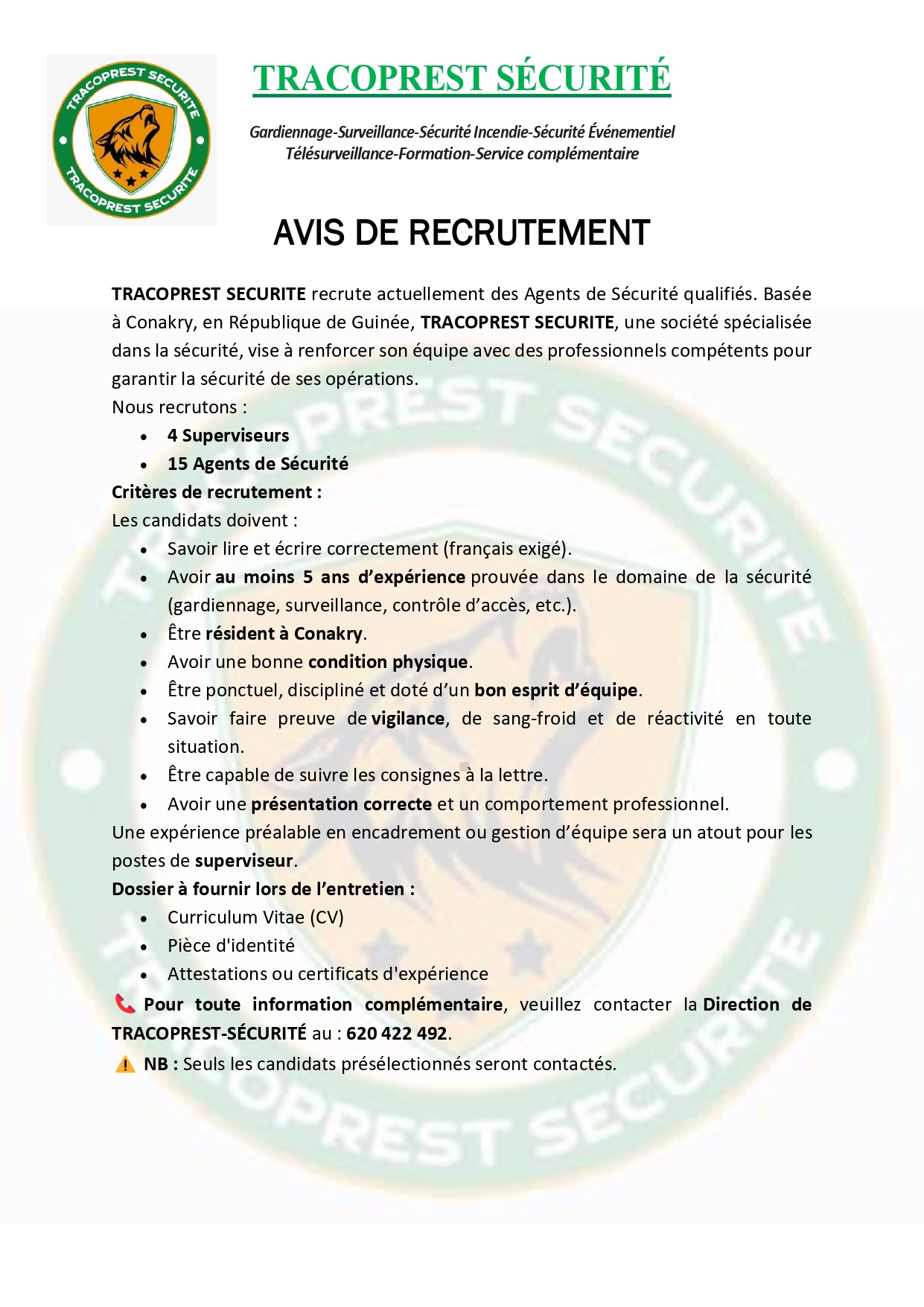 Opportunités d'emplois Avis de recrutement de 4 Superviseurs et 15 Agents de Sécurité Par Sékou Mohamed SAVANE - 23 juin 2025 0 51 FacebookTwitterPinterestWhatsApp
