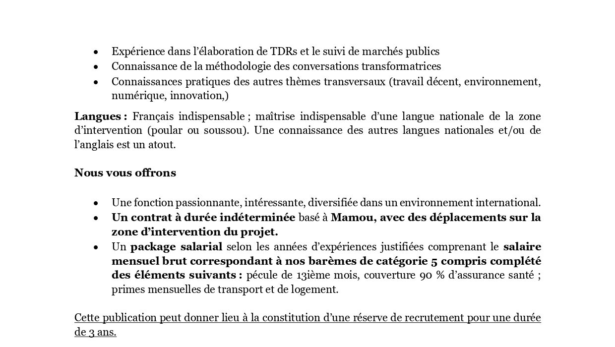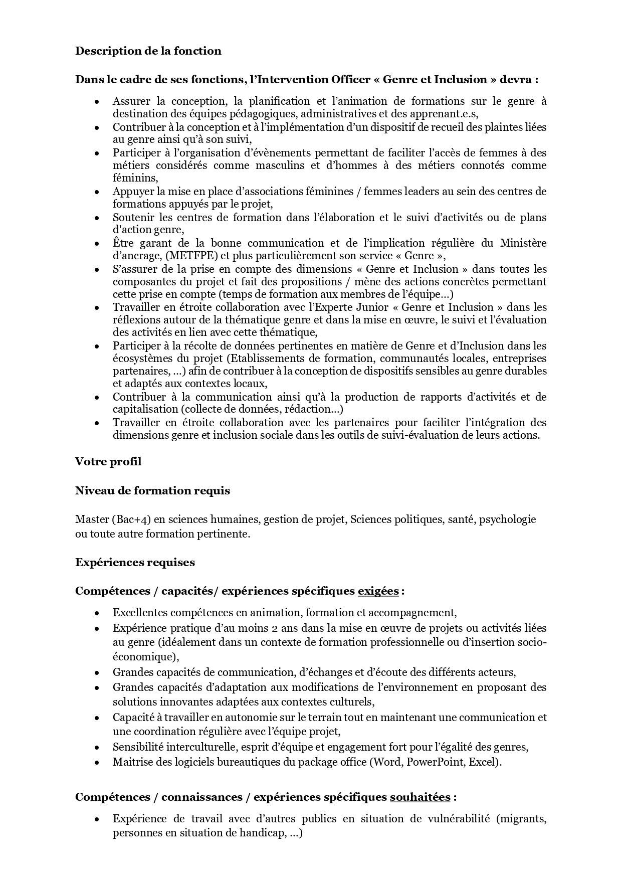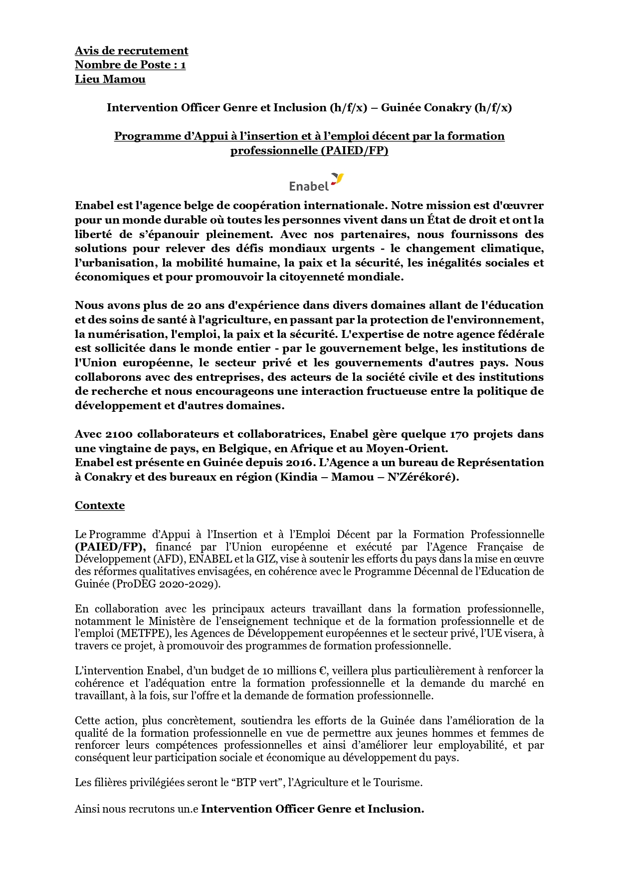 Seules les candidatures introduites via le lien ci-après IO Genre et Inclusion (enabel.be) seront prises en considération et seul (s) les candidat(e)s sélectionné(e)s seront contacté(e)s pour les tests.