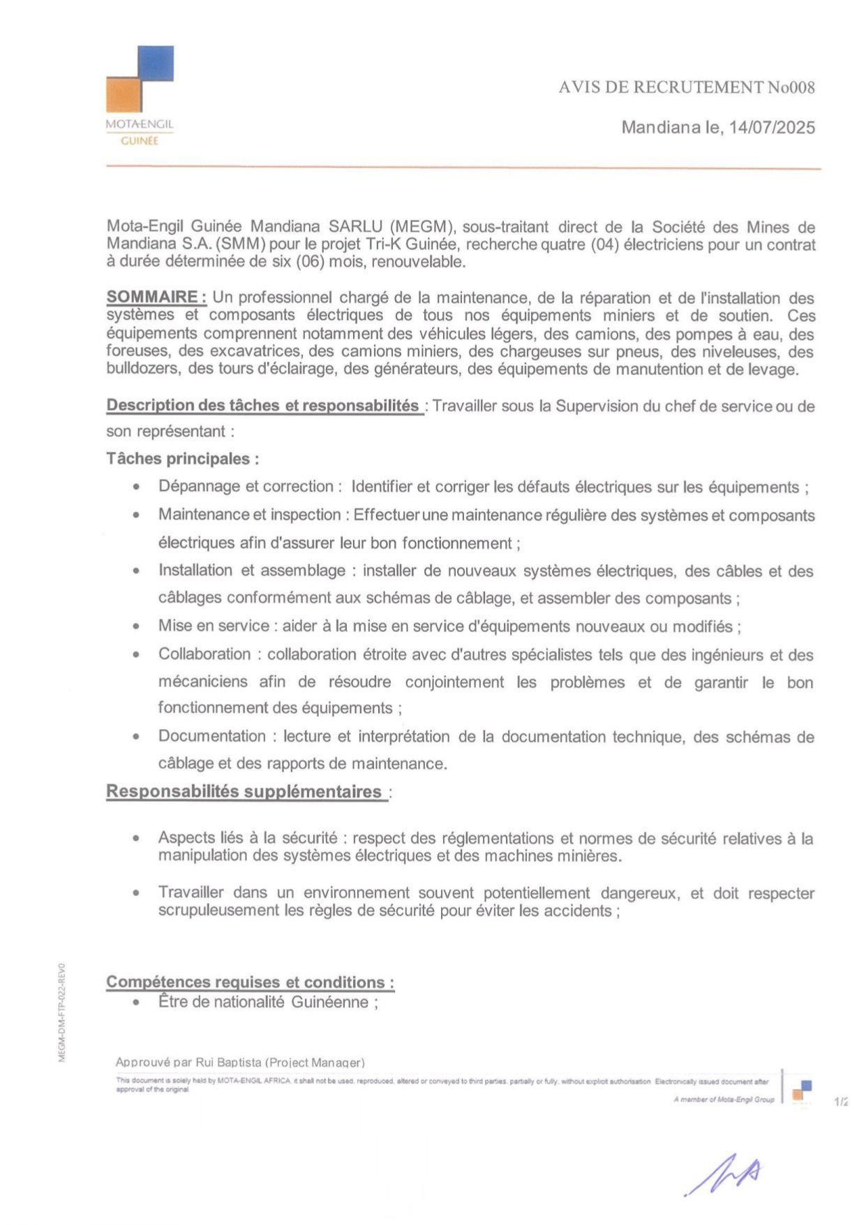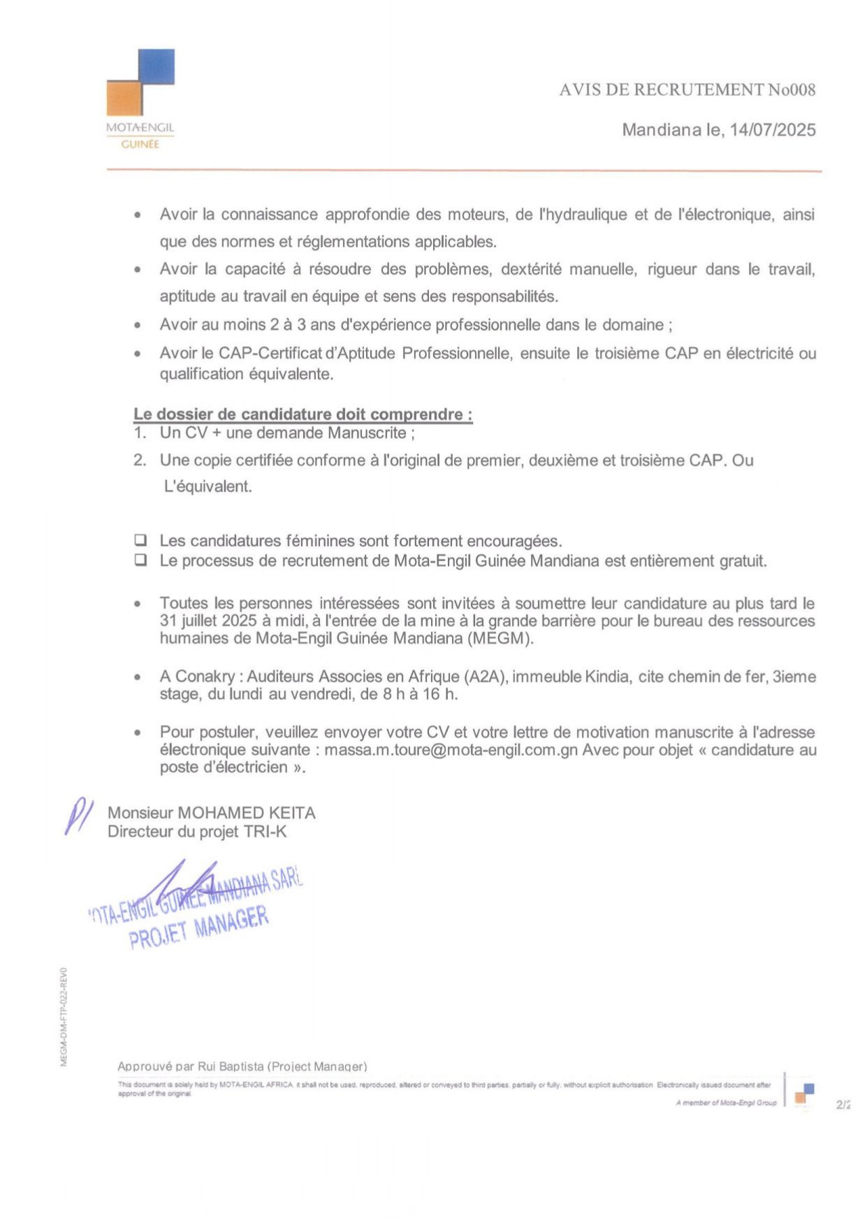 Opportunités d'emplois Avis de recrutement de quatre (04) électriciens pour un contrat à durée déterminée de six (06) mois Par Sékou Mohamed SAVANE - 15 juillet 2025 0 33 FacebookTwitterPinterestWhatsApp