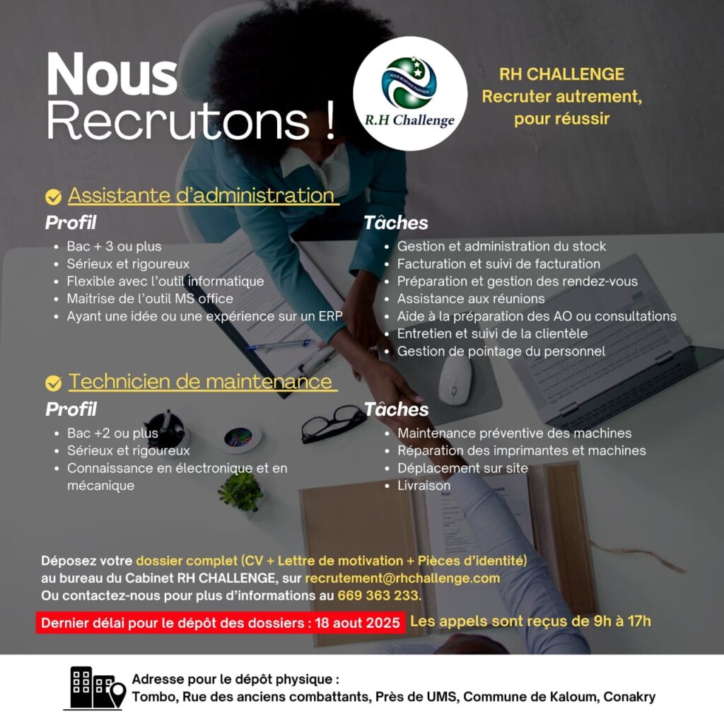 Opportunités d'emplois AVIS DE RECRUTEMENT D’UNE ASSISTANTE D’ADMINISTRATION Par Sékou Mohamed SAVANE - 30 juillet 2025 0 142 FacebookTwitterPinterestWhatsApp