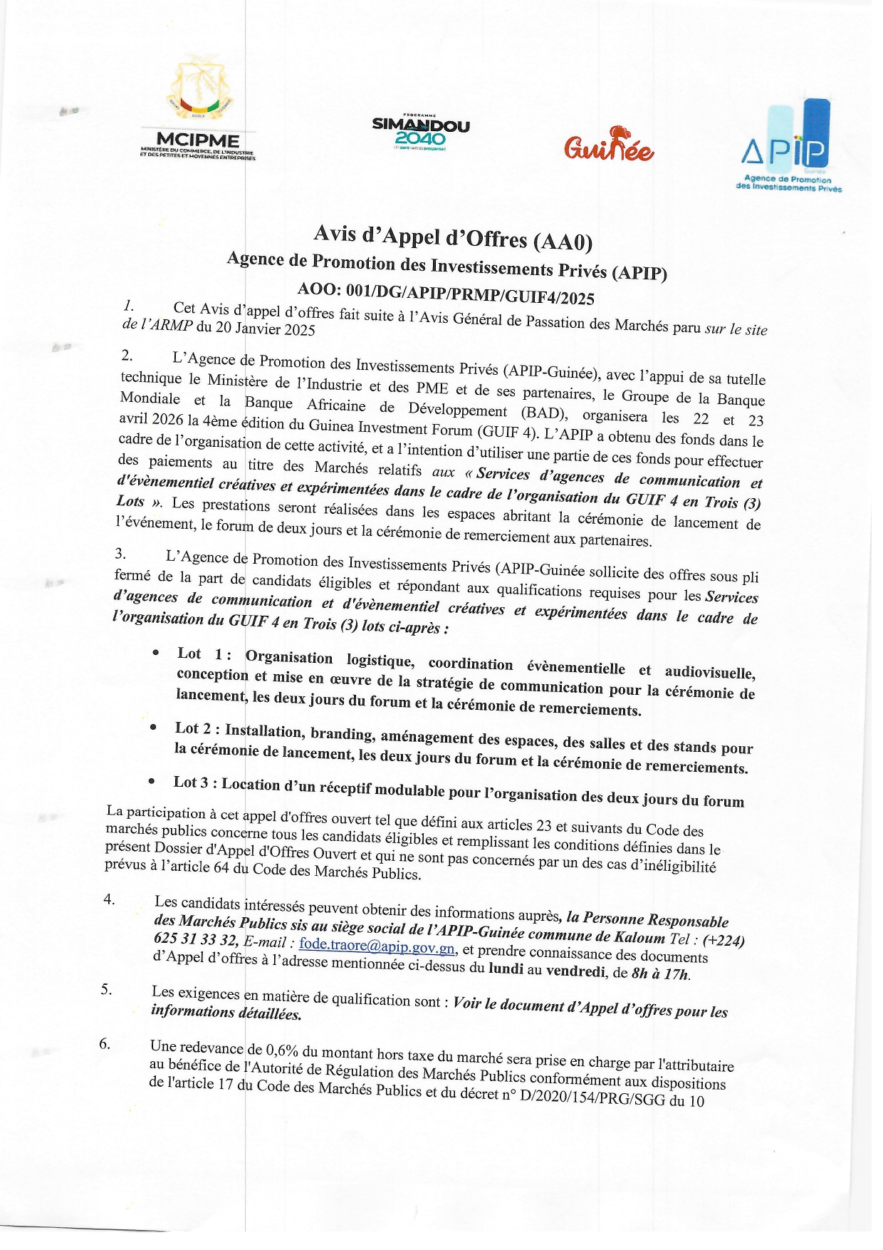 Appels d'offres AVIS D’APPEL D’OFFRES AAO: 001/DG/APIP/PRMP/GUIF4/2025 POUR LE SERVICE DES AGENCES DE COMMUNICATION Par Sékou Mohamed SAVANE - 25 août 2025 0 462 FacebookTwitterPinterestWhatsApp