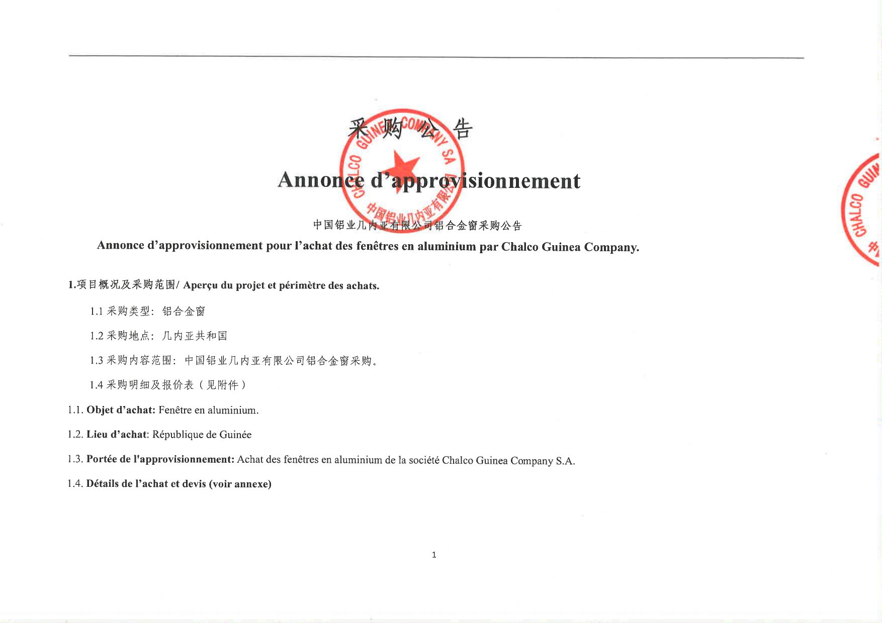 Appels d'offres Annonce d’approvisionnement pour l’achat des fenêtres en aluminium par Chalco Guinea Company Par Sékou Mohamed SAVANE - 15 septembre 2025 0 15 FacebookTwitterPinterestWhatsApp Télécharger l’avis complet en PDF