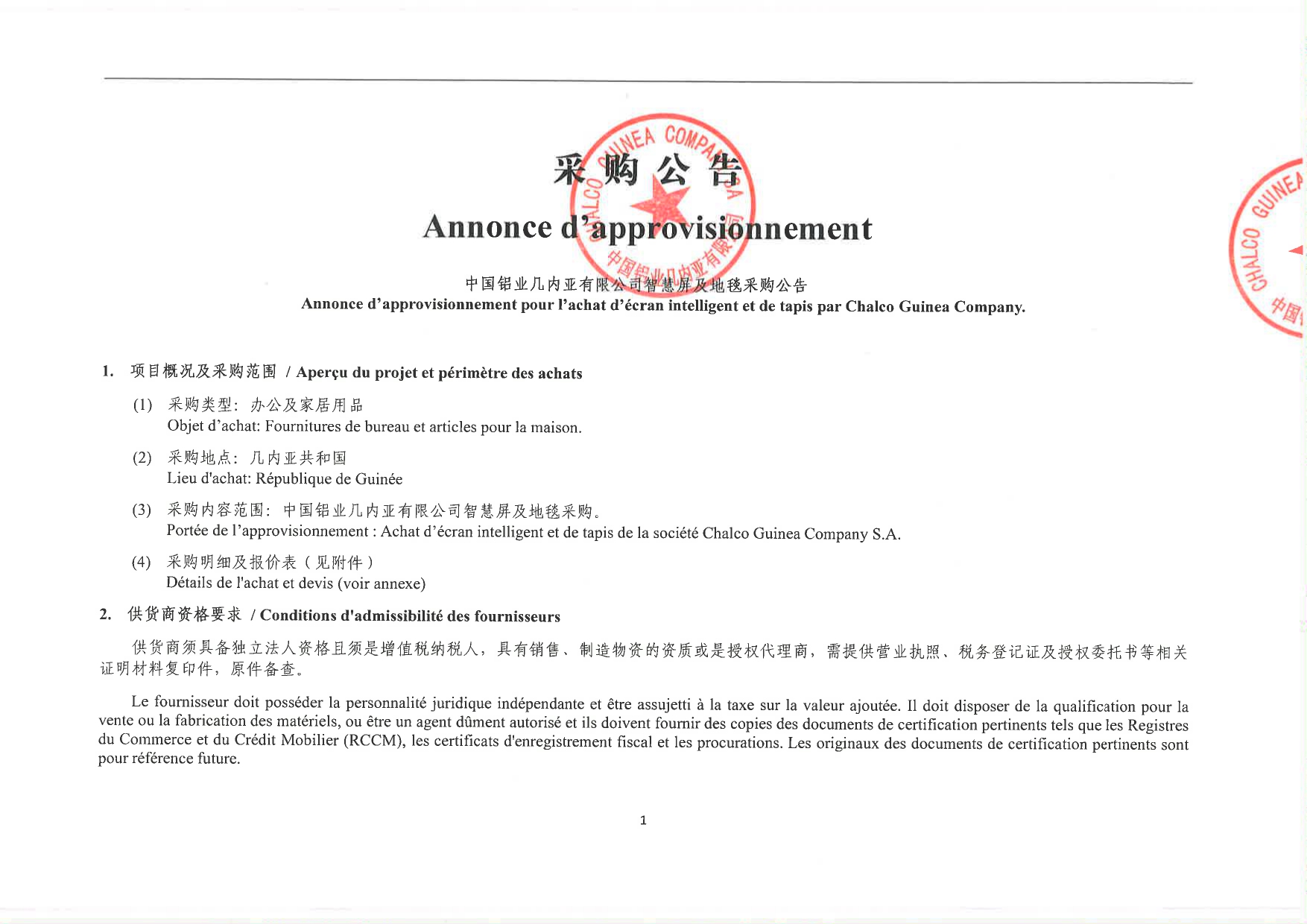 Appels d'offres Annonce d’approvisionnement pour l’achat d’écran intelligent et de tapis par Chalco Guinea Company Par Sékou Mohamed SAVANE - 19 septembre 2025 0 21 FacebookTwitterPinterestWhatsApp Télécharger l’avis complet en PDF