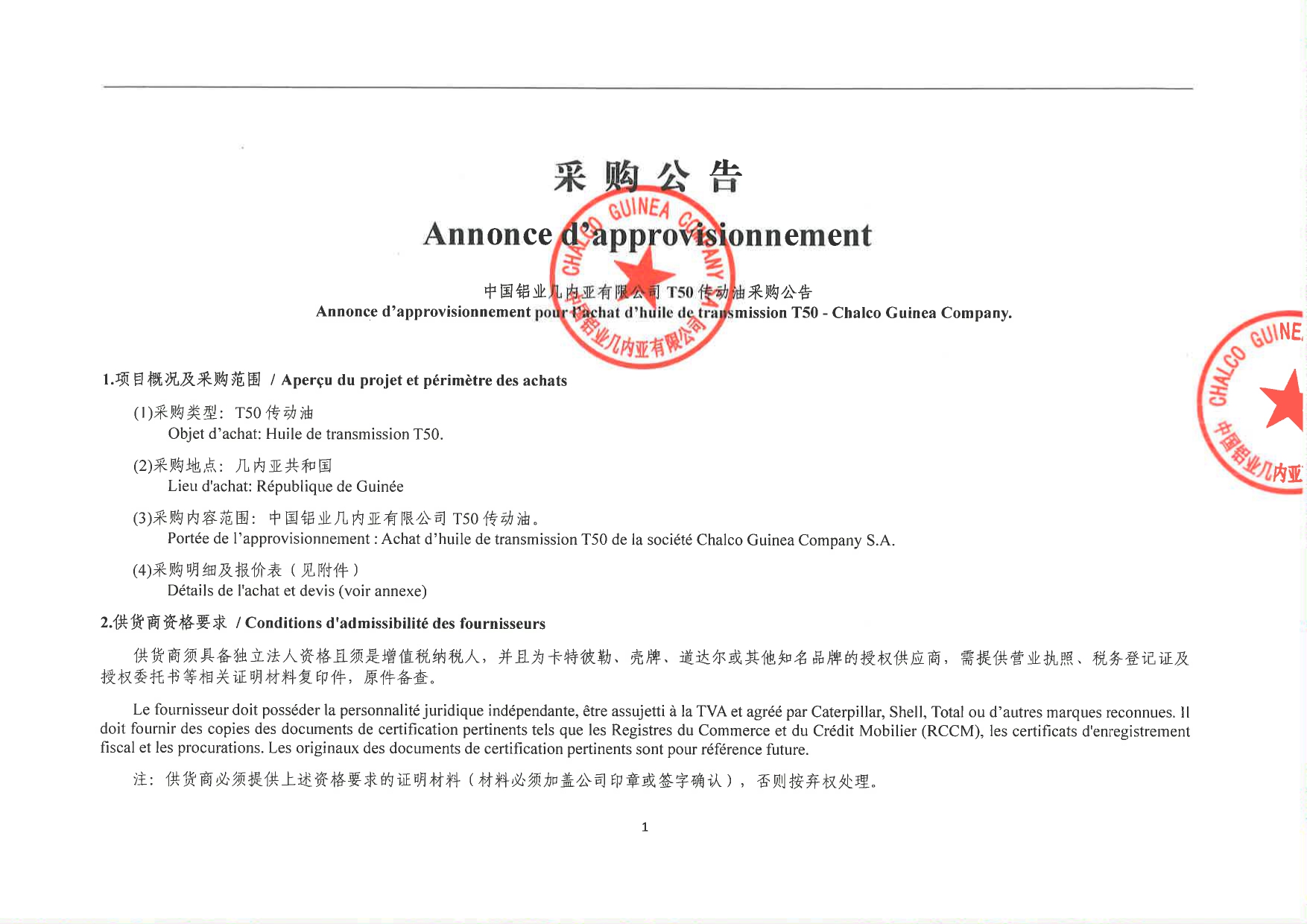 Appels d'offres Annonce d’approvisionnement pour l’achat d’huile de transmission T50 – Chalco Guinea Company Par Sékou Mohamed SAVANE - 26 novembre 2025 0 6 FacebookTwitterPinterestWhatsApp Télécharger l’avis complet en PDF