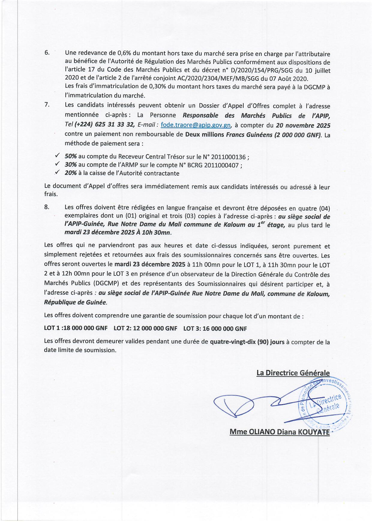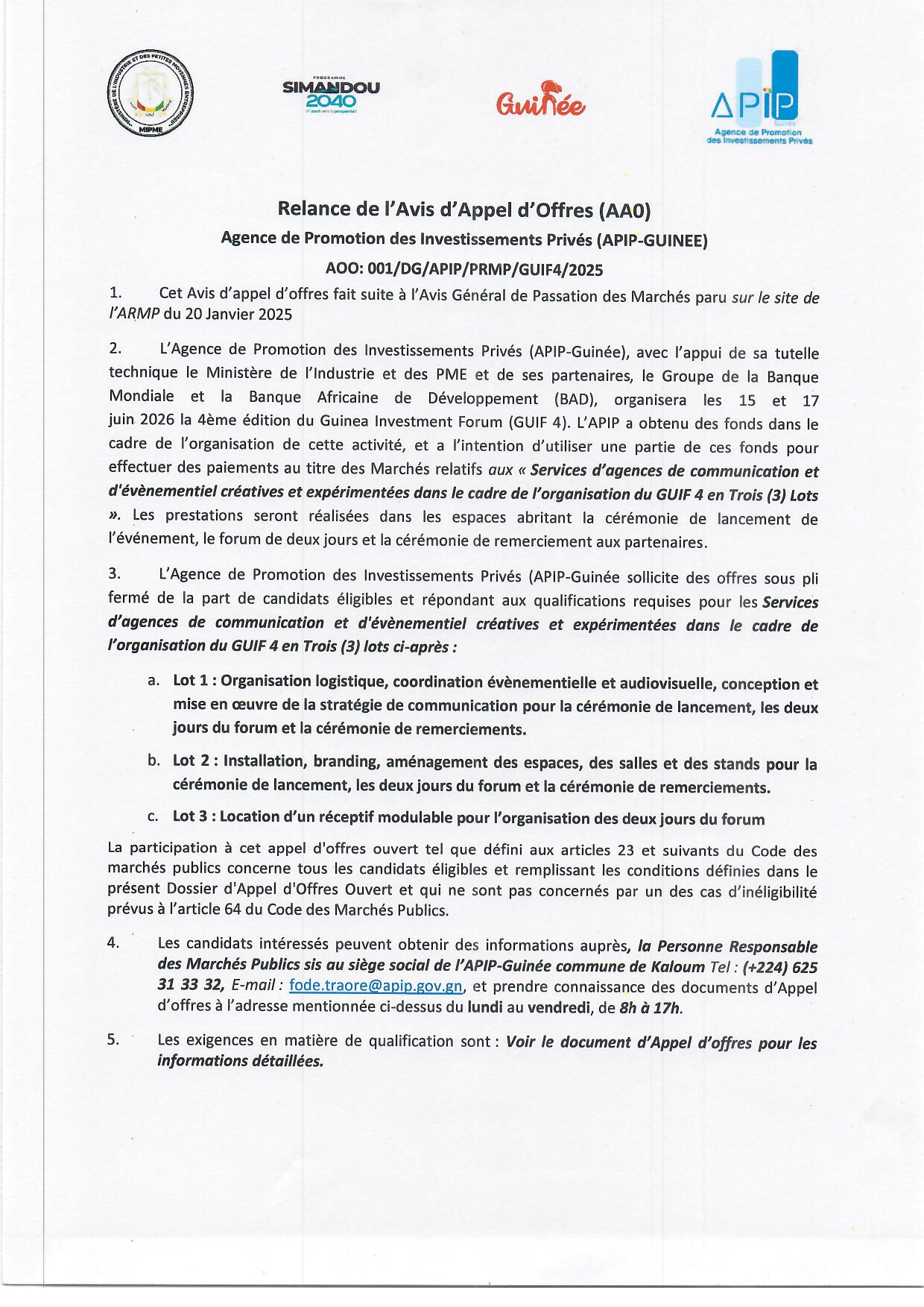 Appels d'offres Relance de I’ Avis d’ Appel d’Offres {AA0) – Agence de Promotion des Investissements Privés (APIP-GUINEE) AOO: 001/DG/ APIP /PRMP /GUIF4/2025 Par lesannonces1compte - 8 décembre 2025 0 22 FacebookTwitterPinterestWhatsApp Télécharger l’avis en PDF