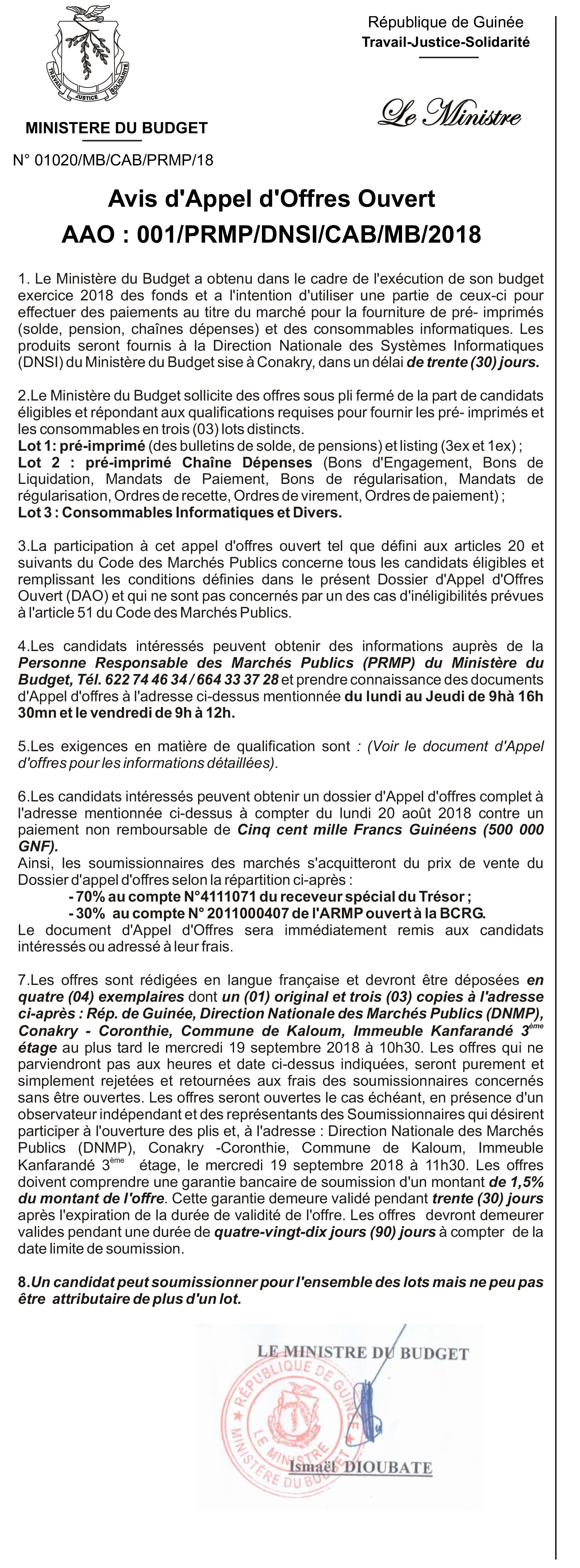 Appels d'offres MINISTERE DU BUDGET: Avis d’Appel d’Offres Ouvert Par lesannonces1compte - 3 septembre 2018 0 863 FacebookTwitterPinterestWhatsApp